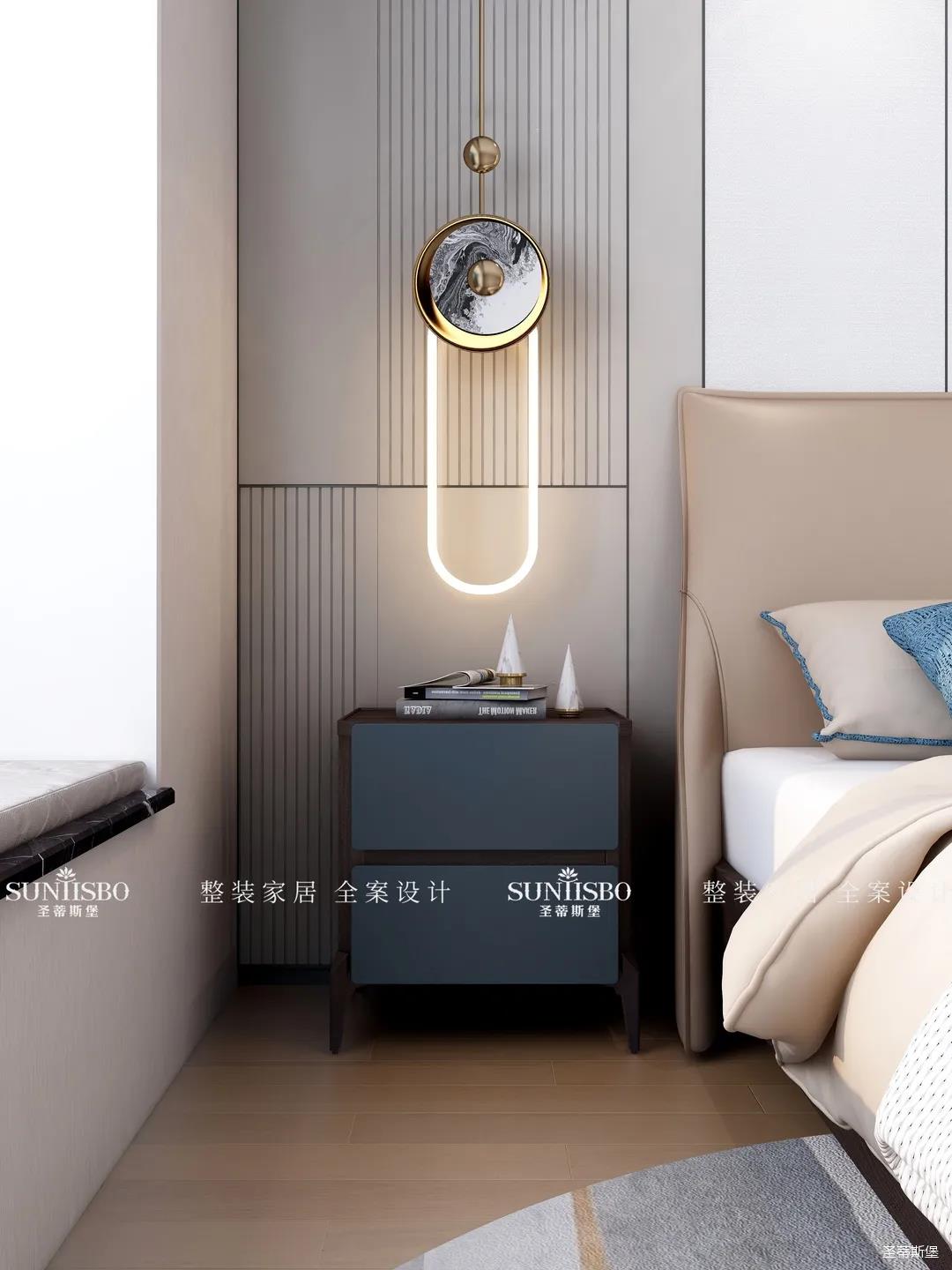 卧室把自然光线纳入空间。稳重的浅咖色床屏搭配柔和的灰白护墙,渲染了空间去繁从简的设计。品质精致的床品面料触感自然柔软,真皮质地的家具匹配空间气质,为业主营造了舒适惬意的休憩空间。